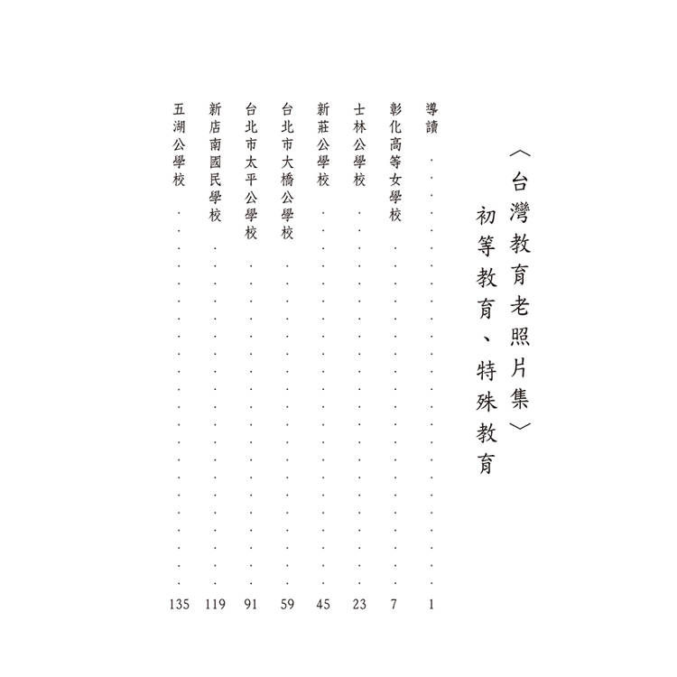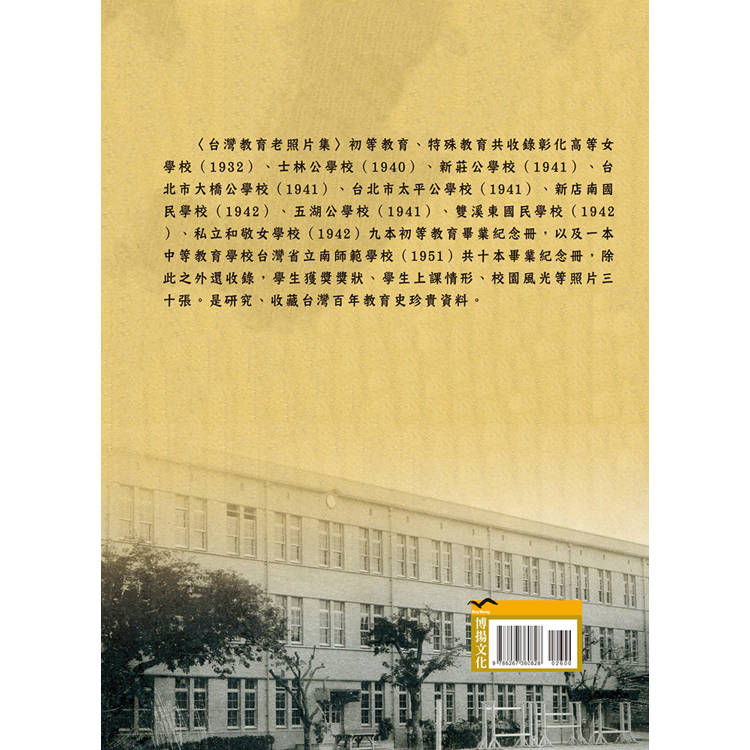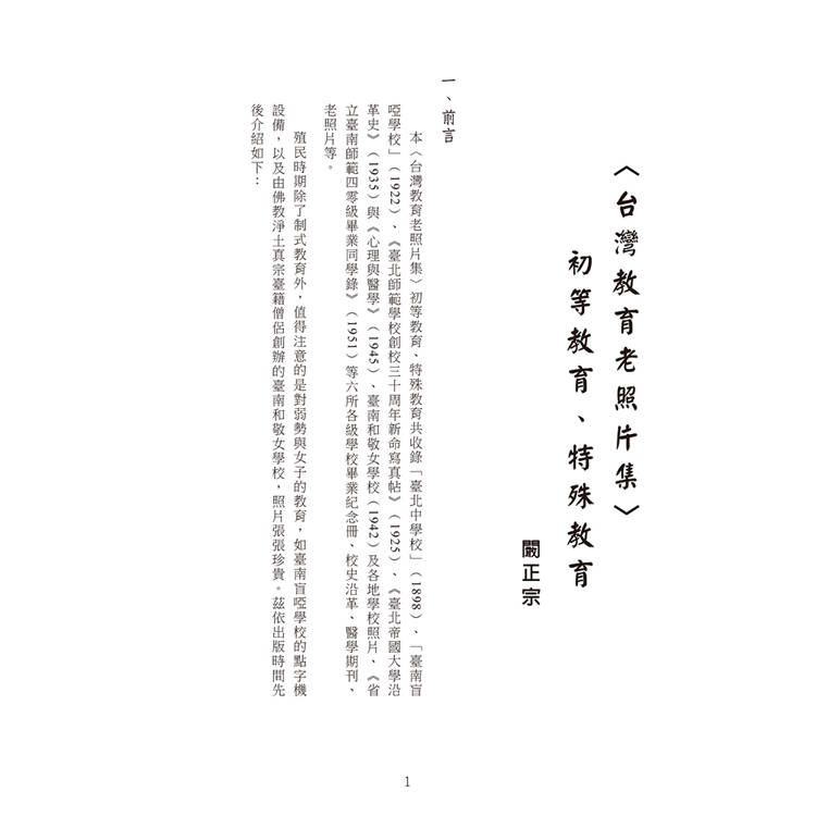 〈台灣教育老照片集〉初等教育、特殊教育共收錄彰化高等女學校(1932)、士林公學校(1940)、新莊公學校(1941)、台北市大橋公學校(1941)、台北市太平公學校(1941)、新店南國民學校(1942)、五湖公學校(1941)、雙溪東國民學校(1942)、私立和敬女學校(1942)九本初等教育畢業紀念冊,以及一本中等教育學校台灣省立南師範學校(1951)共十本畢業紀念冊,除此之外還收錄,學生獲獎獎狀、學生上課情形、校園風光等照片三十張。是研究、收藏台灣百年教育史珍貴資料。