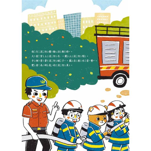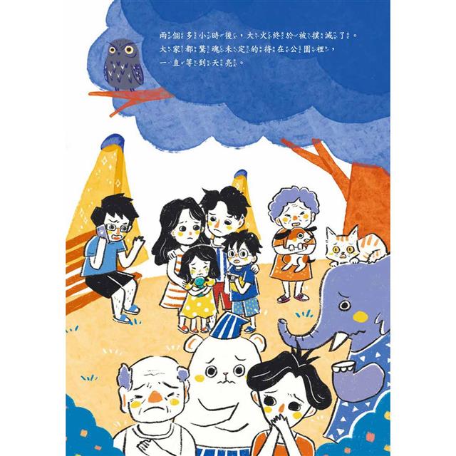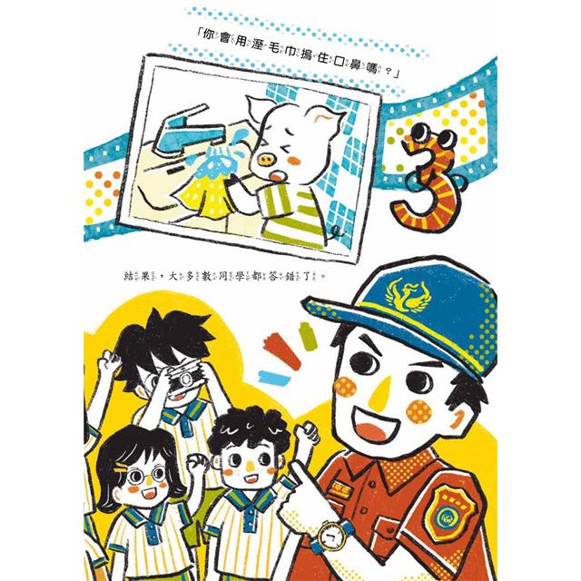 在版面設計時,同時將各要素納入考慮,包括文字位置、圖像大小和對比等。維持插圖之間的連貫性,運用適當的空白和留白,以增強視覺清晰度和閱讀的舒適度。比如:在構圖設計方面,運用滿版的方式呈現火災現場民眾的緊張情緒和火災的危險,像是故事中一開始的火災場景以及後續學生們面對濃煙體驗的過程。這種滿版呈現方式,使讀者更深刻的參與故事中。此外,當消防員提出問題時,選擇以底片和照片的方式呈現背景,增添整體畫面趣味性,也呼應主角小安對攝影的興趣,使故事更加豐富而生動。