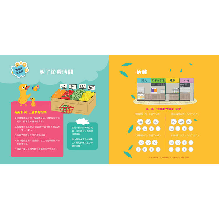 書末還附上情境練習與找零題目,讓孩子將故事中的能力帶回日常生活,真正做到「在生活中運用數學」的素養目標。