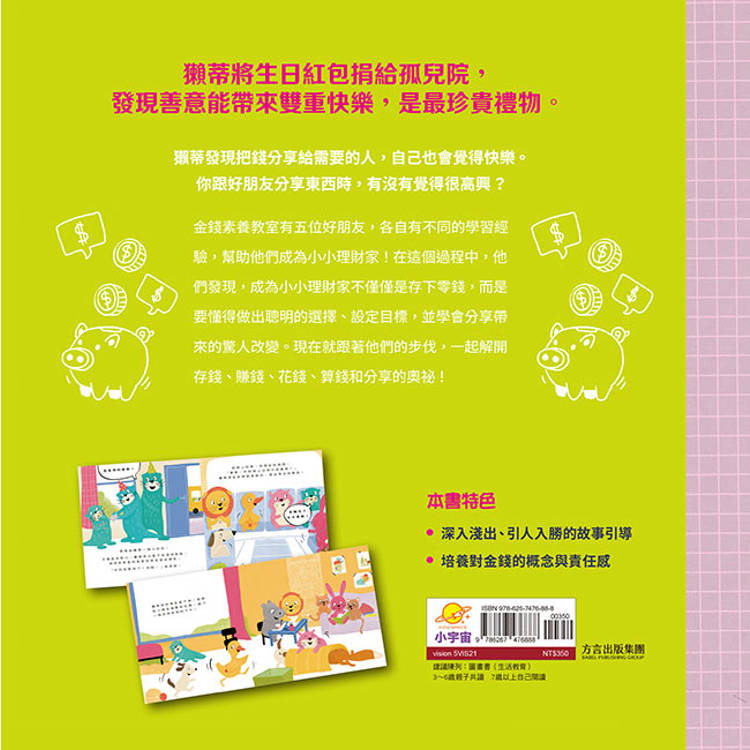 ◇ 五大核心概念:該系列圍繞「賺錢、算錢、存錢、花錢、分享」五個核心概念展開,主題涵蓋全面,幫助孩子建立完整金錢觀。