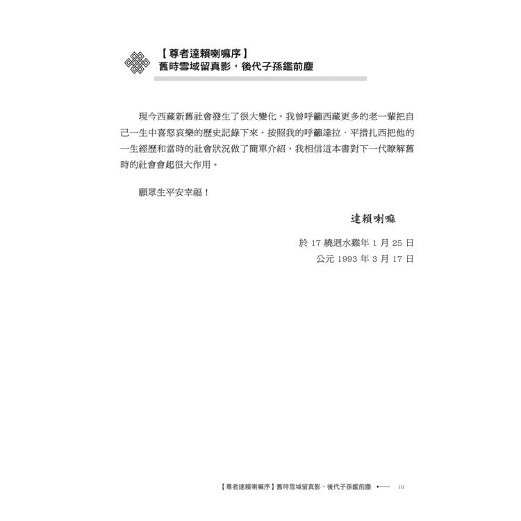「現今西藏新舊社會發生了很大變化,我曾呼籲西藏更多的老一輩把自己一生中喜怒哀樂的歷史記錄下來,按照我的呼籲達拉・平措扎西把他的一生經歷和當時的社會狀況做了簡單介紹,我相信這本書對下一代瞭解舊時的社會會起很大作用。願眾生平安幸福!」——尊者達賴喇嘛
