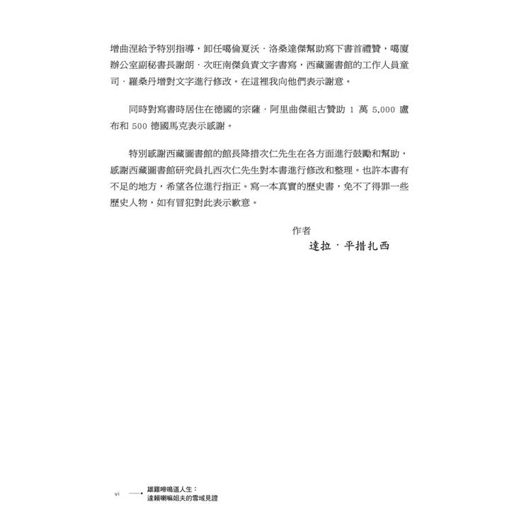 特別感謝西藏圖書館的館長降措次仁先生在各方面進行鼓勵和幫助,感謝西藏圖書館研究員扎西次仁先生對本書進行修改和整理。也許本書有不足的地方,希望各位進行指正。寫一本真實的歷史書,免不了得罪一些歷史人物,如有冒犯對此表示歉意。