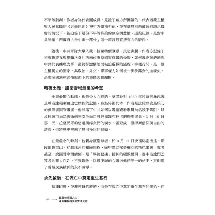 在最危急的時刻,他親身護衛尊者,於 3 月 17 日夜裡秘密出逃。那段翻越雪山、穿越冰河的艱險旅程,途中僅以摻著細沙的糌粑果腹,尊者甚至一度因受寒而病倒,是「篳路藍縷」精神的極致體現。書中沿途門巴等各地藏人百姓,不畏艱險,以最虔誠的心護送他們唯一的祜主,更彰顯了雪域民族精神的永不凋零。