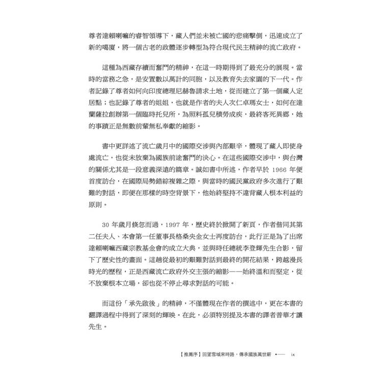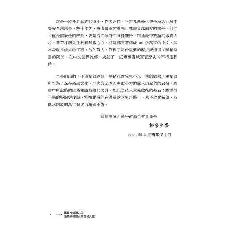 「本書的出版,不僅是對達拉・平措扎西先生不凡一生的致敬,更是對所有為了保存西藏文化、歷史與宗教而奉獻心力的藏人前輩們的致敬。願書中所記錄的這段篳路藍縷的歲月,能化為後人承先啟後的基石;願雪域子民的堅韌與虔誠,能激勵我們在漫長的回家之路上,永不放棄希望,為傳承國族的萬世薪火而精進不懈。」——格桑堅參,達賴喇嘛西藏宗教基金會董事長