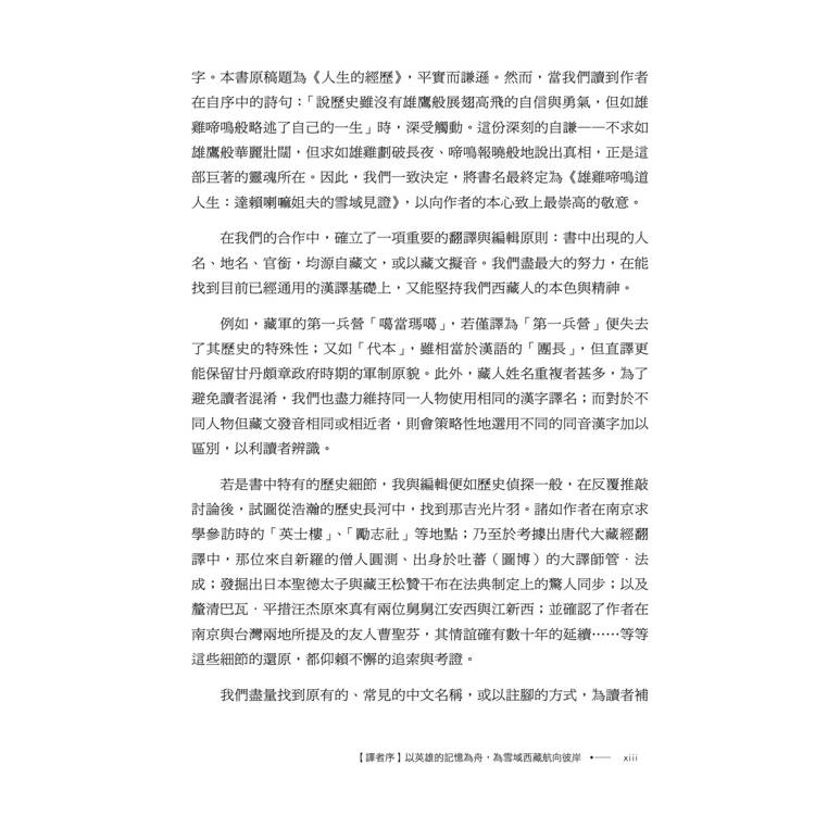 本書的篇章,將我們從安多宗喀地區的田園牧歌,猛然拉進了「紅色風暴」席捲雪域高原的殘酷現實。作者以其特殊的身份,從堯西家族成員到尊者侍衛代本,再到西藏和平談判代表團成員,他站在歷史漩渦的最中心,為我們留下了第一手的珍貴見證。