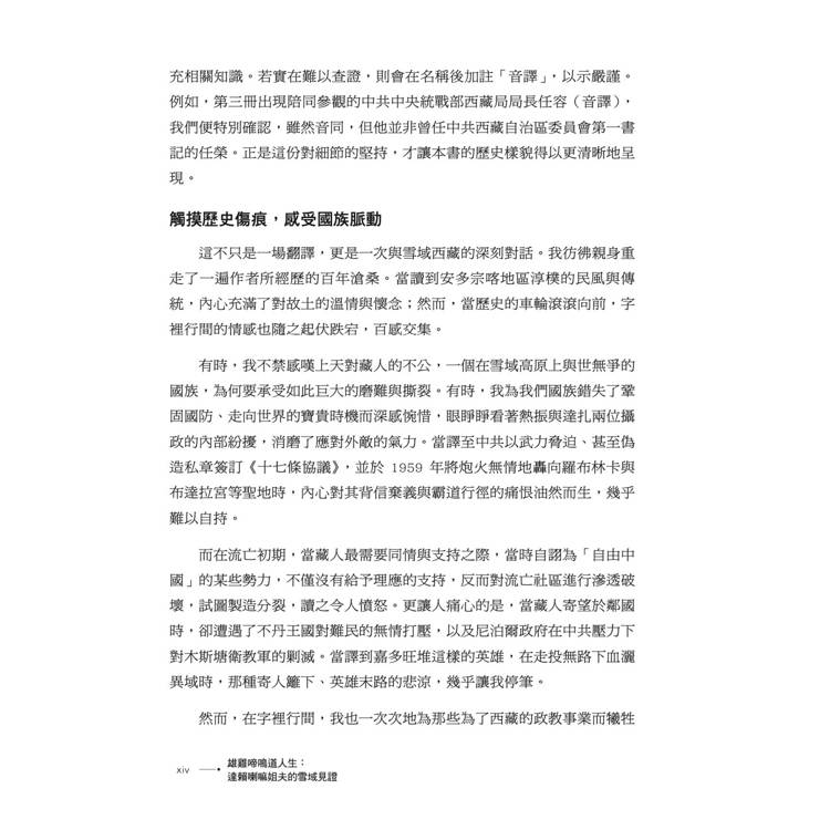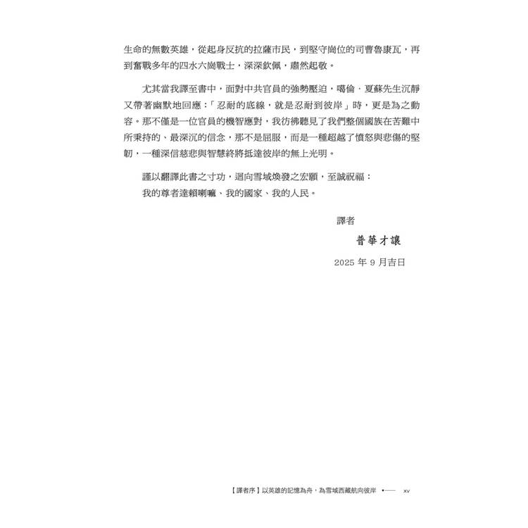 因此,閱讀這本書,不僅是為了「觸摸歷史傷痕」,更是為了「感受國族脈動」。它是一部關於失去的書,更是一部關於重生、關於堅韌、關於永不放棄希望的書。誠摯地將它呈獻給所有關心西藏、熱愛和平的讀者。