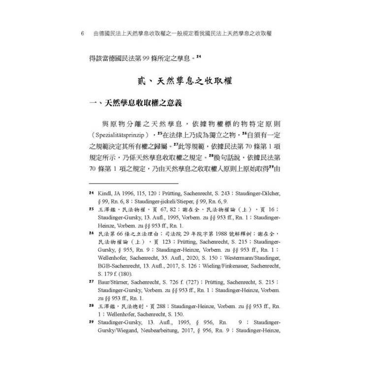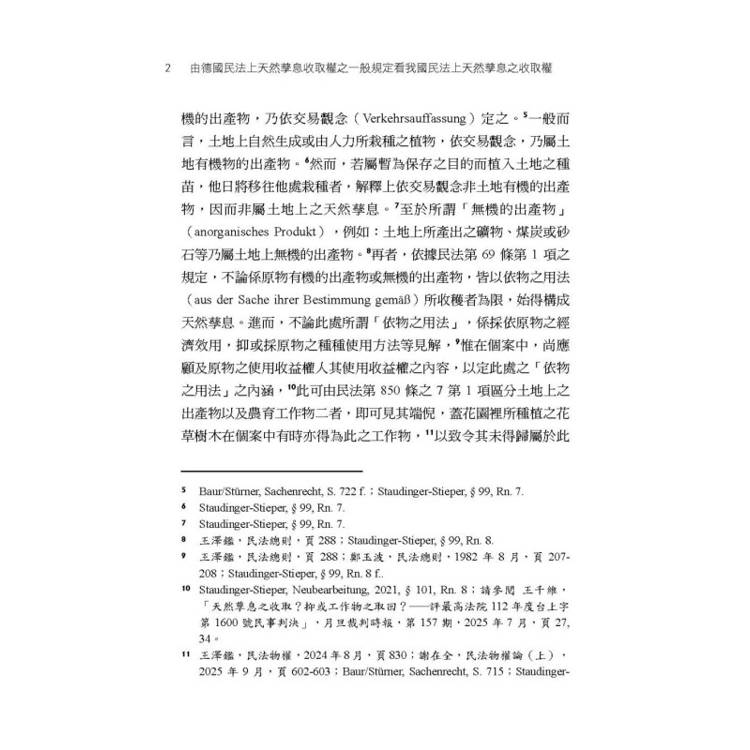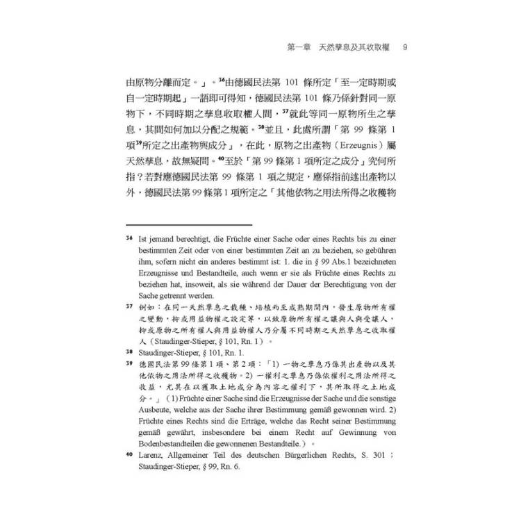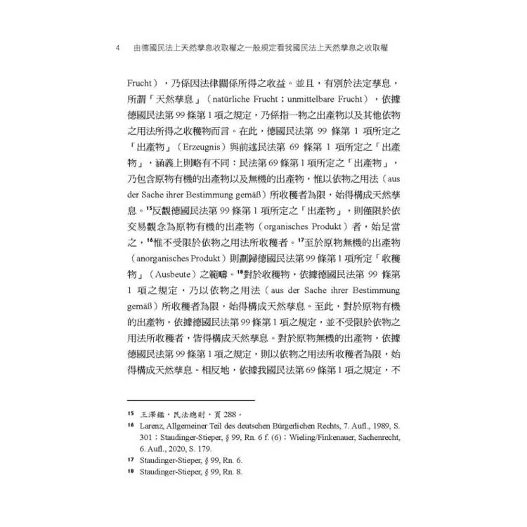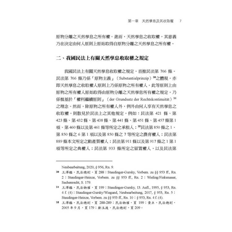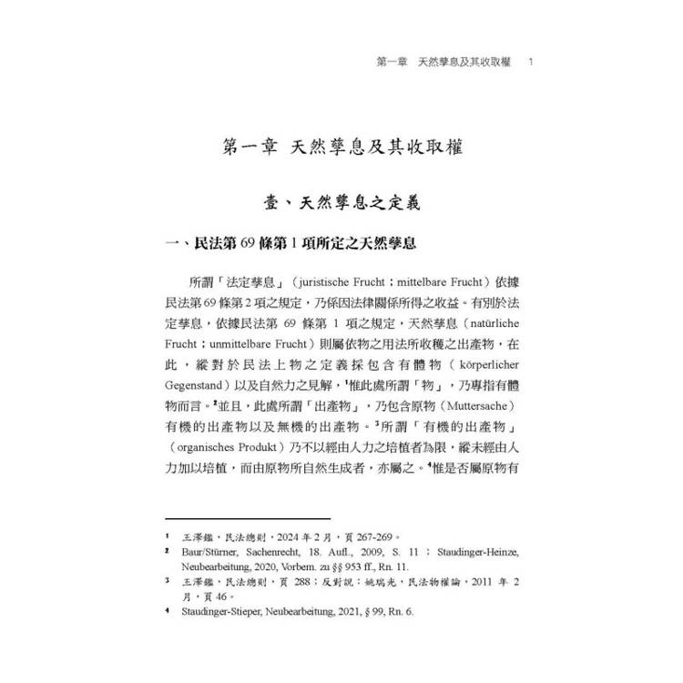 德國民法第953條至第957條等有關天然孳息收取權之一般規定,首先乃在揭示,若在原物上具備所有權、用益物權或善意占有等法律關係,乃至基於債權收取權之授與者,則有發生天然孳息收取權之可能性。同時,德國民法第953條至第957條等,又再進一步規範上開基於不同原因所發生之天然孳息之收取權其間之優先次序。鑑於我國民法物權編對於天然孳息之收取權,除民法第766條外,並無如德國民法第953條至第957條等設有一般規定,從而,本書乃在德國民法第953條至第957條等規定之基礎上,檢視我國民法上之天然孳息之收取權。