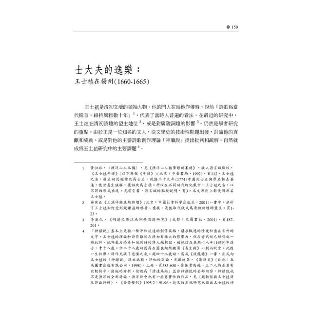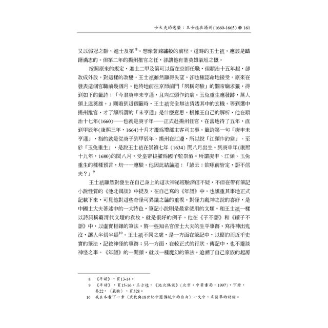 在本文中,我則試圖從生活史的角度出發,以王士禛在揚州五年 (1660-1665) 的仕宦生涯為基礎,探討一位文人/士大夫在清初江南生活的全貌,包括他的宗教信仰、在公務上的努力與挫折、官員/詩人角色的轉換,以及與前朝遺民、布衣文人、當朝官員的交游網絡。我也將討論他日常的詩酒酬酢、宴游活動及對揚州與江南景物的流連。和過去習慣從思想史、學術史或文學史、政治史的取徑著手,來探討有重要影響的歷史人物不同的是,本文將從生活的細微末節出發,為明清士大夫文化的研究,提供另一個詳細的個案和新的視角。並希望透過士大夫個人豐富的生活經驗,來重建一個和現代世界不同的文化風貌和生活型態。
