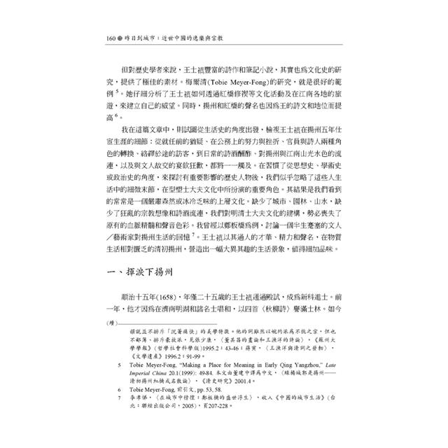 這些文章中第三個明顯的主題是城市。從上海到揚州到南京,城市為民眾的休閑、娛樂和士大夫的精緻品味提供了不可或缺的舞台。〈十八世紀中國社會中的情欲與身體〉一文的主體雖然多半是從各地搜集而來,「鄙俚淫褻」、出諸「里巷婦女」或「村嫗蕩婦」之口的情歌小唱,但不論是唱本的刊行、販賣,茶館、戲園的演出,或是像《馬頭調》之類,經由通都、大邑的碼頭、驛站而流傳的民間小調,都依然和城市有密切的關係。冒襄水繪園所在的揚州府如皋縣,雖然不能和北京、南京、揚州或蘇州之類全國性的城市相比,但卻因為冒本人和南京、揚州的密切關係,提供了我們一個重新思考上層士大夫如何在縣城,乃至鄉鎮,複製大城市的生活經驗和文化型態的機會。