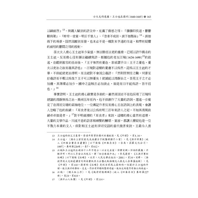 我在這篇文章中,則試圖從生活史的角度出發,檢視王士禛在揚州五年仕宦生涯的細節:從就任前的猶疑、在公務上的努力與挫折、官員與詩人兩種角色的轉換、絡繹於途的訪客,到日常的詩酒酬酢、對揚州與江南山光水色的流連,以及與文人故交的宴飲狂歡,都將一一觸及。在習慣了從思想史、學術史或政治史的角度,來探討有重要影響的歷史人物後,我們似乎忽略了這些人生活中的細微末節,在型塑士大夫文化中所扮演的重要角色。其結果是我們看到的常常是一個嚴肅森然或冰冷乏味的上層文化。缺少了城市、園林、山水,缺少了狂亂的宗教想像和詩酒流連,我們對明清士大夫文化的建構,勢必喪失了原有的血脈精髓和聲音色彩。我曾經以鄭板橋為例,討論一個半生蹇塞的文人/藝術家對揚州生活的回憶。 王士禛以其過人的才華、精力和聲名,在物質生活相對匱乏的清初揚州,營造出一幅大異其趣的生活景象,值得細加品味。