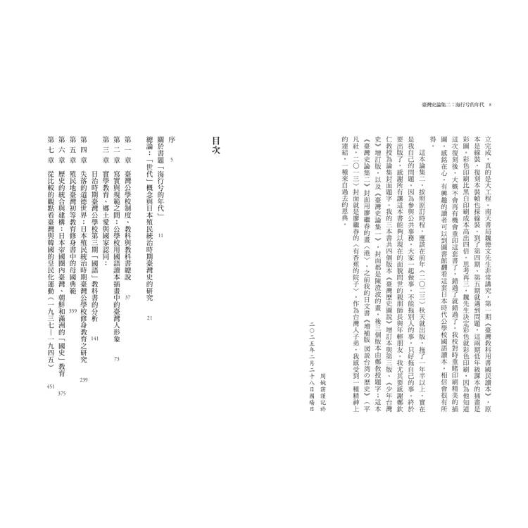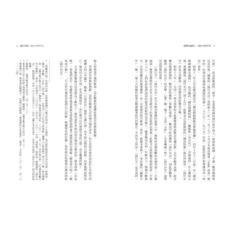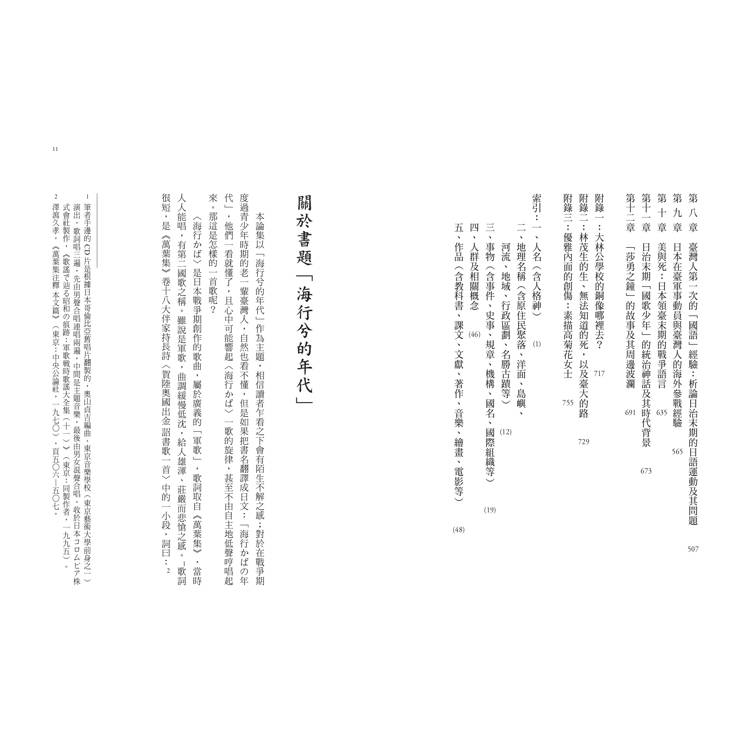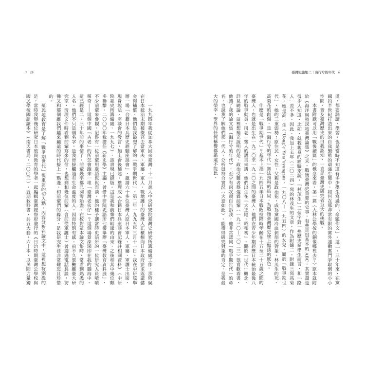 這是《臺灣史論集》的第二冊,以「海行兮的年代」為題,時間上以日本殖民統治中後期為研究對象,人群則以「戰爭期世代」為焦點。收有十二篇論文,以及三篇附錄,作為「戰後續篇」的引子。