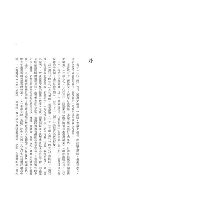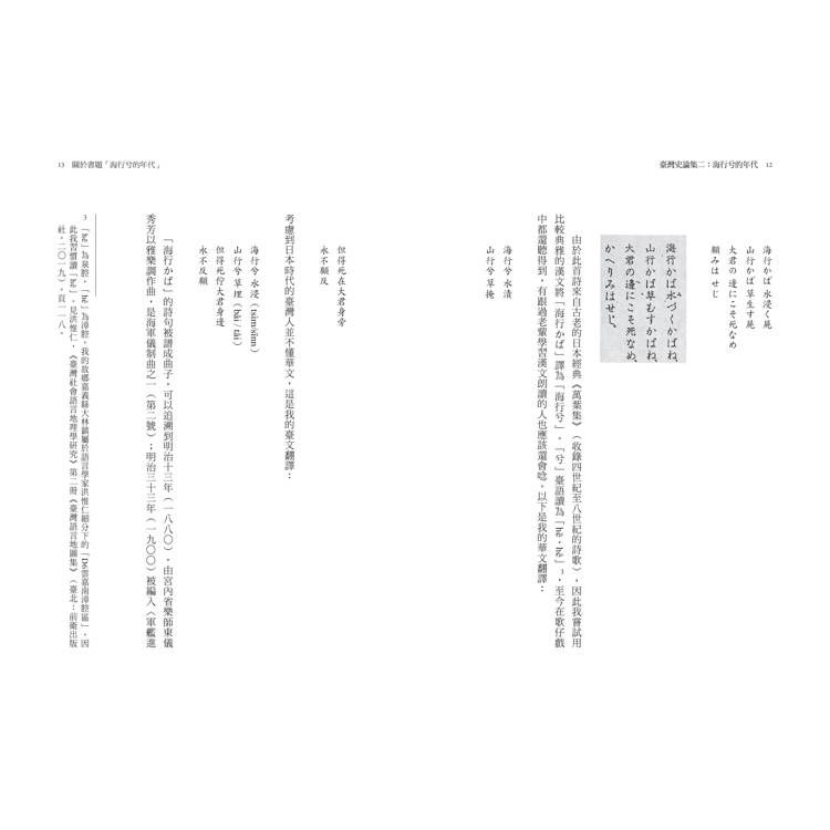 以「海行兮的年代」作為書題,需要解釋。二十二年前《海行兮的年代》出版時,「海行兮」的這個詞對讀者來說,相當陌生,「海行兮的年代」更不可解。因此,我特地寫了一篇〈書名說明〉,放在該論文集的總論(代序)之後。即使到現在,我想應該也未必容易了解,因此還是將這篇說明增補新資料,放在本書序文之後。知識的傳遞和擴散其實不容易,在資訊爆炸的多元民主社會,更無法期許學術研究的結果可以「滲透」到社會,普為人知。臺灣史知識是在解嚴後,尤其一九九○年代臺灣自由民主化之後才開始有機會普及;反觀過去 KMT/ROC 黨國時代,數十年來透過鋪天蓋地的管道,一文一書都可能「洗版」社會,比如一九七○年代初期我讀高中時,一本薄薄的《天地一沙鷗》,經當時中華民國行政院長蔣經國一品題,全臺灣的學生都知道,都要誦讀、學習,也是當時不知道有多少學生寫過的「命題作文」。這二、三十年來,在黨國約半世紀打造出來的自我繁殖的頑強生態中,如何在那非常有限的黨外運動奮鬥爭取到的小小空間,普及臺灣歷史的自我認知,一直是臺灣史研究者巨大的挑戰。