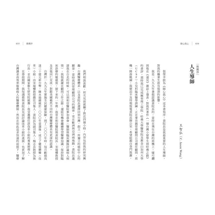 黃院長於一九六○年代起在賓夕法尼亞大學及杜克大學接受訓練及任教。那段時期正是美國醫學的黃金年代。當我閱讀他與同儕及導師的互動描述時,也不禁想起自己在美國的醫學教育經驗。我很幸運在學習過程中遇到許多善良有洞見,並熱心幫助學生在臨床照護與科研之路上成長的導師。藉這次寫序的契機,讓我好好回顧這些年與黃院長的交流與學習的點點滴滴。如今我明白了「薪火相傳」的意涵──在培育下一代醫師領袖的過程中,回饋並傳承所學。