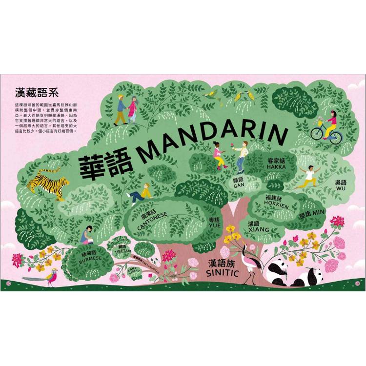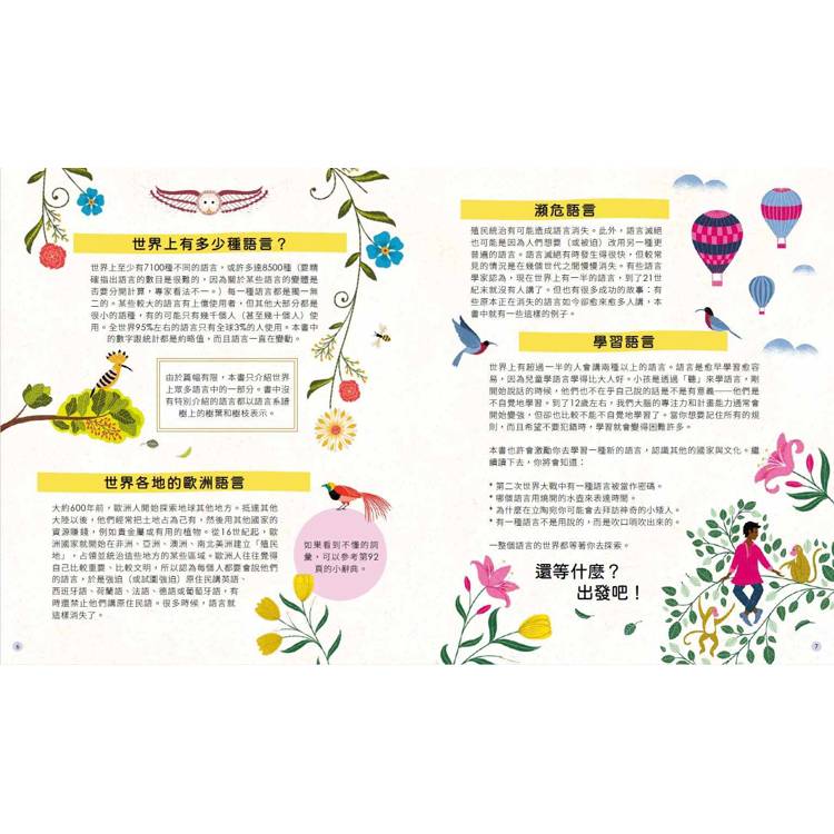 ˙精細優美的繪圖,呈現出融合各地文化場景的語言樹、地圖和特殊風貌,為讀者帶來一場精采絕倫的視覺盛宴。