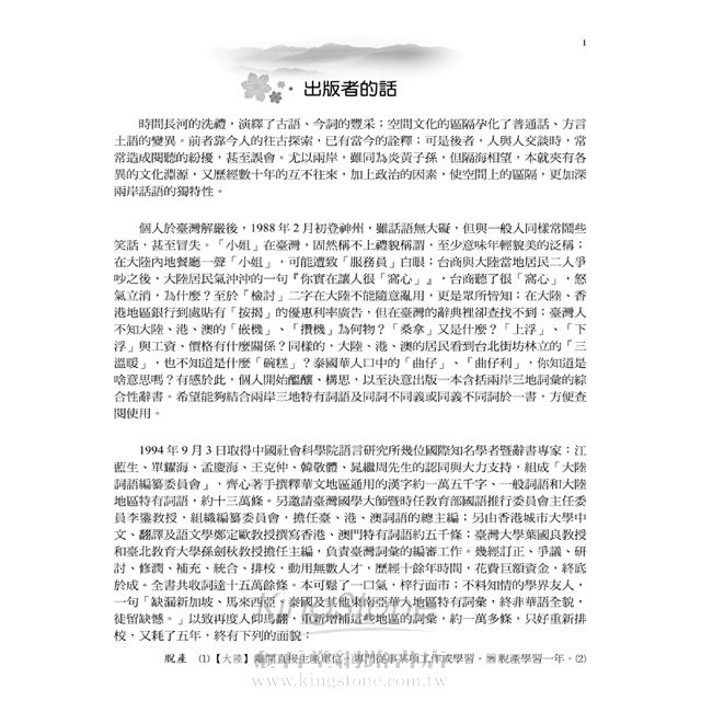 這部辭典感謝大家共同努力,排除萬難,終於可以問世了。但在歷經十七年編纂過程中所感受的甘苦,猶如「寒天飲冰水,冷暖自知」,非局外人所能理解。編辭典本來就是一件苦差事,何況編的是兩岸三地與東南亞各國華人所需求古今兼備的辭書,其難度是可以想像出來的。而且所有的編輯群,又分屬兩岸四地,北京、臺北、香港、福州,無法集中辦事,只好用接力的方式,一站編好再交給下一站,連有疑問都無法當面請益,只能靠電話、傳真或E-mail來聯絡。不過這也有好處,就是每一詞條都要經過一站又一站地審閱,減少差錯。其中最令人感動的,莫過於楊董事長榮川先生,以他一個人的力量,要推動完成這千秋大業,投進的人力物力姑且不說,就以他的雄心壯志,他的鍥而不捨的毅力,都不得不令人敬佩。我相信沒有一個出版商能忍受一部辭書要經過十七年才能完成的事實。他這種智慧、這種遠見,絕非一般出版商所能做到的,只有「文化人」才有這份胸襟。因為他曾