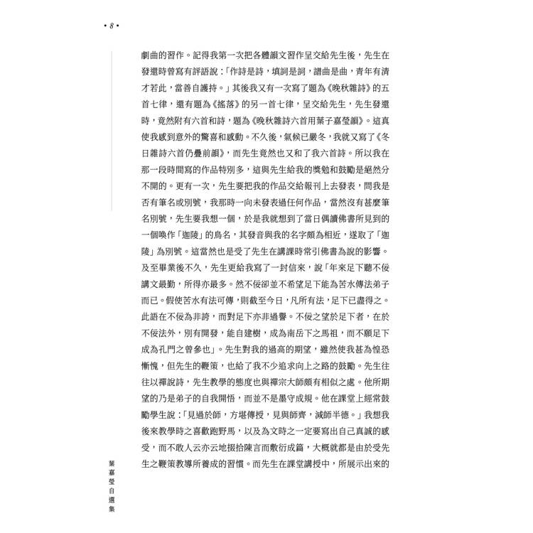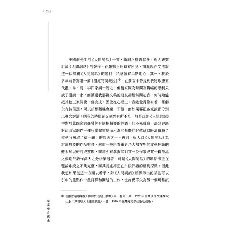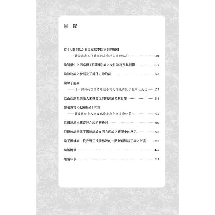 本書為葉嘉瑩先生親手擇定的詞論作品集。九篇論析文章及一部隨筆,涵蓋了自晚唐五代時期至於清代的詞人,既探求「詞」這一文學體式要眇幽微的特美,又標舉各代詞家的特色及成就,呈現了葉嘉瑩先生精深專注的詞學觀點及理論,發人深省。