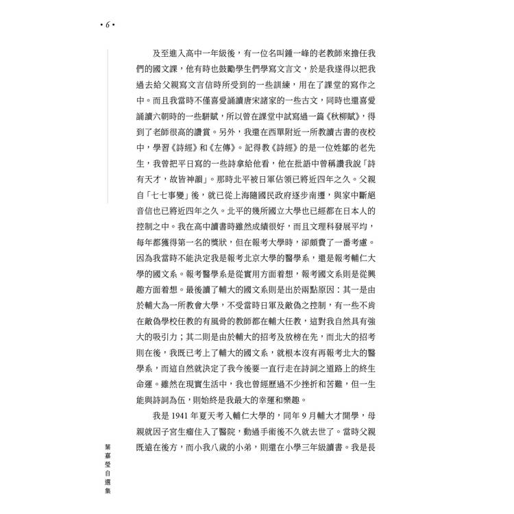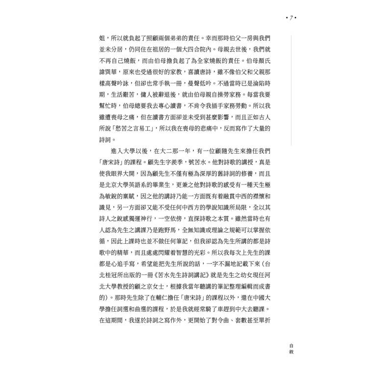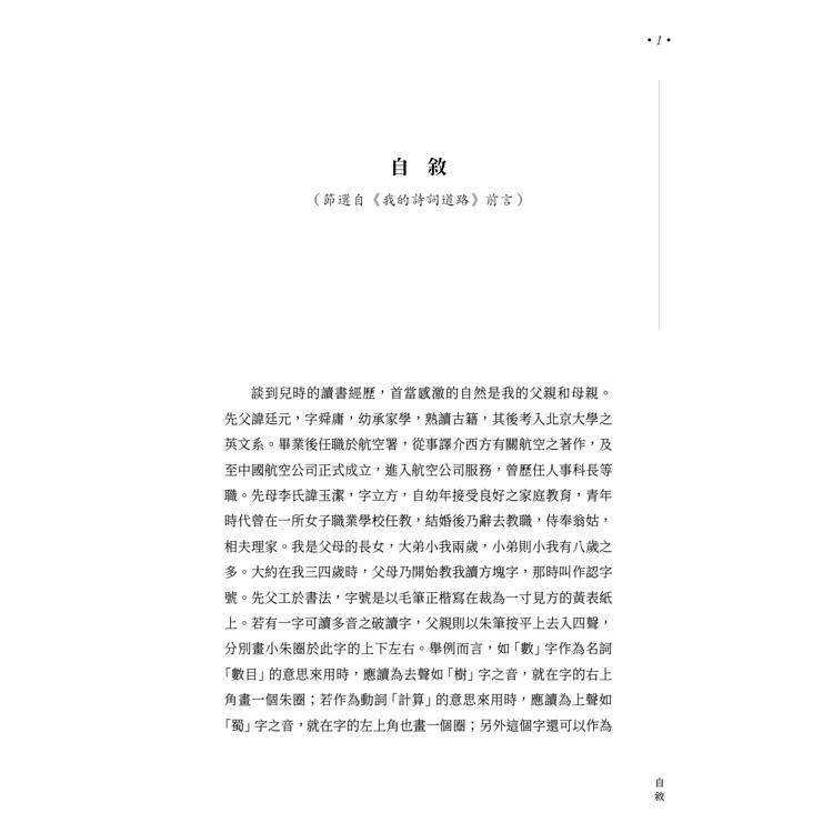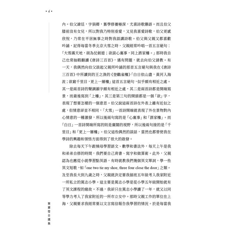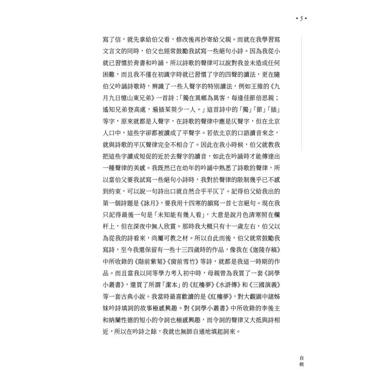 除去每天下午跟姨母學習語文、數學和書法外,每天上午是我和弟弟自修的時間,我們要自己背書、寫字和做算術。此外,父親認為也應從小就學習點英語,有時就教我們幾個英文單詞,學一些英文短歌,如「one two tie my shoe, three four close the door」之類。及至我長大到九歲之時,父親就決定要我插班五年級考入我家附近一所私立的篤志小學。這主要是篤志小學是從小學五年級開始就有了英文課程的緣故。不過,我卻只在篤志小學讀了一年,就又以同等學力考入了我家附近的一所市立女中。那時父親工作的單位在上海,父親要求我經常要以文言寫信報告我學習的情況。於是每當我寫了信,就先拿給伯父看,修改後再抄寄給父親。而就在我學習寫文言文的同時,伯父也經常鼓勵我試寫一些絕句小詩。因為我從小就已習慣於背書和吟誦,所以詩歌的聲律可以說對我並未造成任何困難,而且我不僅在初識字時就已習慣了字的四聲的讀法,更在隨伯父吟誦詩歌時,辨識了一些入聲字的特別讀法,例如王維的《九月九日憶山東兄弟》一首詩:「獨在異鄉為異客,每逢佳節倍思親;遙知兄弟登高處,遍插茱萸少一人。」這首詩中的「獨」「節」「插」等字,原來就都是入聲字,在詩歌的聲律中應是仄聲字,但在北京人口中,這些字卻都被讀成了平聲字。若依北京的口語讀音來念,就與詩歌的平仄聲律完全不相合了。因此在我小時候,伯父就教我把這些字讀成短促的近於去聲字的讀音,如此在吟誦時才能傳達出一種聲律的美感。我既然已在幼年的吟誦中熟悉了詩歌的聲律,所以當伯父要我試寫一些絕句小詩時,我對於聲律的限制幾乎已不感到約束,可以說一句詩出口就自然合乎平仄了。記得伯父給我出的第一個詩題是《詠月》,要我用十四寒的韻寫一首七言絕句。現在我只記得最後一句是「未知能有幾人看」,大意是說月色清寒照在欄杆上,但在深夜中無人欣賞。那時我大概只有十一歲左右,伯父以為從我的詩看來,尚屬可教之材。所以自此而後,伯父就常鼓勵我寫詩,至今我還保留有一些十三四歲時的作品,像我在《迦陵存稿》中所收錄的《階前紫菊》《窗前雪竹》等詩,就都是我這一時期的作品。而且當我以同等學力考入初中時,母親曾為我買了一套《詞學小叢書》,還買了所謂「潔本」的《紅樓夢》《水滸傳》和《三國演義》等一套古典小說。我當時最喜歡讀的是《紅樓夢》,對大觀園中諸姊妹吟詩填詞的故事極感興趣。對《詞學小叢書》中所收錄的李後主和納蘭性德的短小的令詞也極感興趣,而令詞的聲律又大抵與詩相近,所以在吟詩之餘,我就也無師自通地填起詞來。