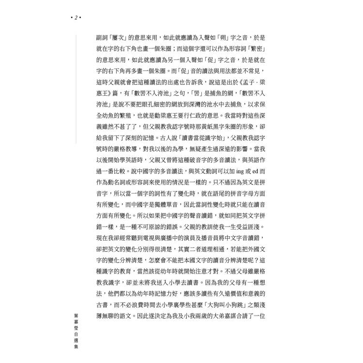 談到兒時的讀書經歷,首當感激的自然是我的父親和母親。先父諱廷元,字舜庸,幼承家學,熟讀古籍,其後考入北京大學之英文系。畢業後任職於航空署,從事譯介西方有關航空之著作,及至中國航空公司正式成立,進入航空公司服務,曾歷任人事科長等職。先母李氏諱玉潔,字立方,自幼年接受良好之家庭教育,青年時代曾在一所女子職業學校任教,結婚後乃辭去教職,侍奉翁姑,相夫理家。我是父母的長女,大弟小我兩歲,小弟則小我有八歲之多。大約在我三四歲時,父母乃開始教我讀方塊字,那時叫作認字號。先父工於書法,字號是以毛筆正楷寫在裁為一寸見方的黃表紙上。若有一字可讀多音之破讀字,父親則以朱筆按平上去入四聲,分別畫小朱圈於此字的上下左右。舉例而言,如「數」字作為名詞「數目」的意思來用時,應讀為去聲如「樹」字之音,就在字的右上角畫一個朱圈;若作為動詞「計算」的意思來用時,應讀為上聲如「蜀」字之音,就在字的左上角也畫一個圈;另外這個字還可以作為副詞「屢次」的意思來用,如此就應讀為入聲如「朔」字之音,於是就在字的右下角也畫一個朱圈;而這個字還可以作為形容詞「繁密」的意思來用,如此就應讀為另一個入聲如「促」字之音,於是就在字的右下角再多畫一個朱圈。而「促」音的讀法與用法都並不常見,這時父親就會把這種讀法的出處也告訴我,說這是出於《孟子·梁惠王》篇,有「數罟不入洿池」之句,「罟」是捕魚的網,「數罟不入洿池」是說不要把眼孔細密的網放到深灣的池水中去捕魚,以求保全幼魚的繁殖,也就是勸梁惠王要行仁政的意思。我當時對這些深義雖然不甚了了,但父親教我認字號時那黃紙黑字朱圈的形象,卻給我留下了深刻的記憶。古人說「讀書當從識字始」,父親教我認字號時的嚴格教導,對我以後的為學,無疑產生過深遠的影響。當我以後開始學英語時,父親又曾將這種破音字的多音讀法,與英語作過一番比較。說中國字的多音讀法,與英文動詞可以加ing或ed而作為動名詞或形容詞來使用的情況是一樣的。只不過因為英文是拼音字,所以當一個字的詞性有了變化時,就在語尾的拼音字母方面有所變化,而中國字是獨體單音,因此當詞性變化時就只能在讀音方面有所變化。所以如果把中國字的聲音讀錯,就如同把英文字拼錯一樣,是一種不可原諒的錯誤。