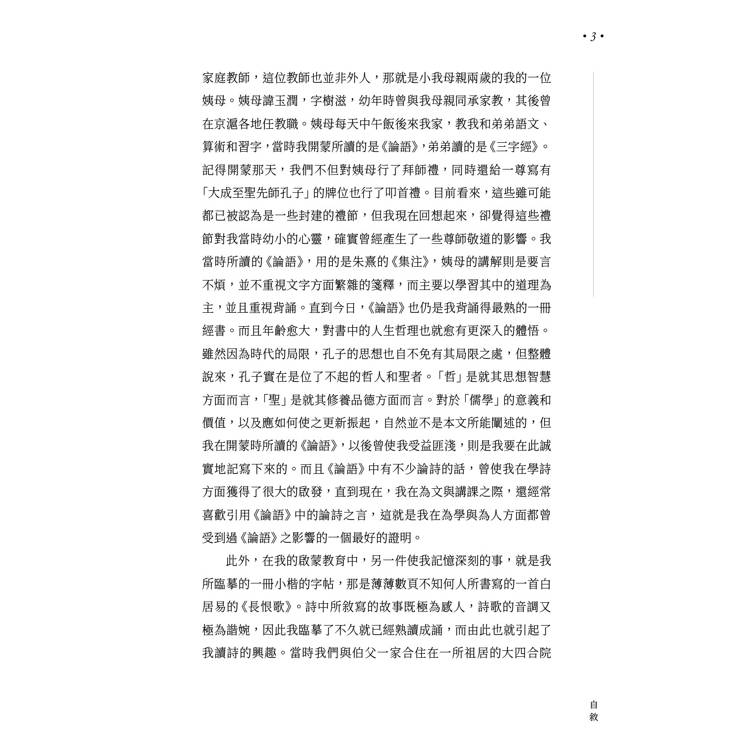 父親的教訓使我一生受益匪淺。現在我卻經常聽到電視與廣播中的演員及播音員將中文字音讀錯,卻把英文的變化分別得很清楚,其實二者道理相通,若能把外國文字的變化分辨清楚,怎麼會不能把本國文字的讀音分辨清楚呢?這種識字的教育,當然該從幼年時就開始注意才對。不過父母雖嚴格教我識字,卻並未將我送入小學去讀書。因為我的父母有一種想法,他們都以為幼年時記憶力好,應該多讀些有久遠價值和意義的古書,而不必浪費時間去小學裏學些甚麼「大狗叫小狗跳」之類淺薄無聊的語文。因此遂決定為我及小我兩歲的大弟嘉謀合請了一位家庭教師,這位教師也並非外人,那就是小我母親兩歲的我的一位姨母。姨母諱玉潤,字樹滋,幼年時曾與我母親同承家教,其後曾在京滬各地任教職。姨母每天中午飯後來我家,教我和弟弟語文、算術和習字,當時我開蒙所讀的是《論語》,弟弟讀的是《三字經》。記得開蒙那天,我們不但對姨母行了拜師禮,同時還給一尊寫有「大成至聖先師孔子」的牌位也行了叩首禮。目前看來,這些雖可能都已被認為是一些封建的禮節,但我現在回想起來,卻覺得這些禮節對我當時幼小的心靈,確實曾經產生了一些尊師敬道的影響。我當時所讀的《論語》,用的是朱熹的《集注》,姨母的講解則是要言不煩,並不重視文字方面繁雜的箋釋,而主要以學習其中的道理為主,並且重視背誦。直到今日,《論語》也仍是我背誦得最熟的一冊經書。而且年齡愈大,對書中的人生哲理也就愈有更深入的體悟。雖然因為時代的局限,孔子的思想也自不免有其局限之處,但整體說來,孔子實在是位了不起的哲人和聖者。「哲」是就其思想智慧方面而言,「聖」是就其修養品德方面而言。對於「儒學」的意義和價值,以及應如何使之更新振起,自然並不是本文所能闡述的,但我在開蒙時所讀的《論語》,以後曾使我受益匪淺,則是我要在此誠實地記寫下來的。而且《論語》中有不少論詩的話,曾使我在學詩方面獲得了很大的啟發,直到現在,我在為文與講課之際,還經常喜歡引用《論語》中的論詩之言,這就是我在為學與為人方面都曾受到過《論語》之影響的一個最好的證明。