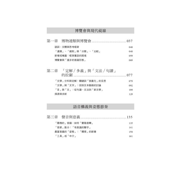 本書重新探索「文法」與「句讀」相迎應的動態過程,勾勒自詩界革命以來的漢語詩論述,如何在技術體系、工業文明的惘惘憂懼中,引生從語音分節到姿態節奏、從語序連斷到活軟肌理的種種說法;其中由足之進止來往,模擬往復力動的心聲意態,並同步體現由物我「相與(相感)」至於「相對」的意象旋轉與存有變動,一個不能被當代語言學所設定,而必須由身體自我來進行重設的語言現象,其實早已經在二十世紀初期宣告了漢語詩自己的「現代」轉向!