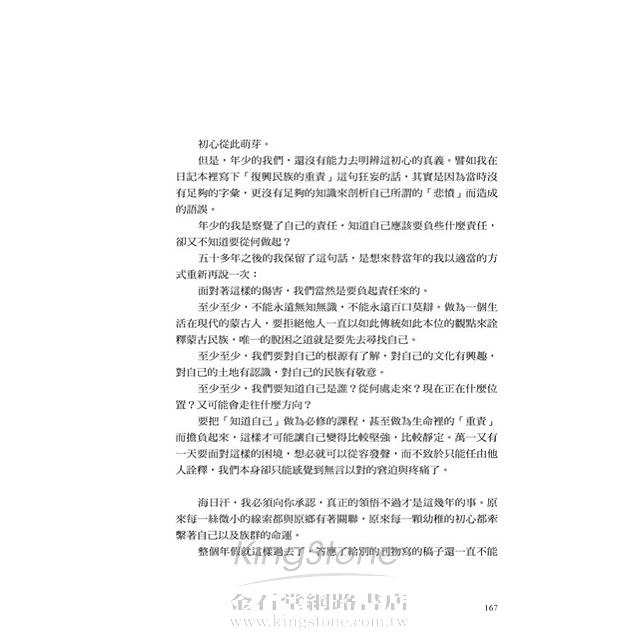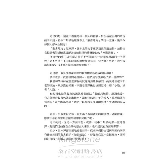 席慕蓉從不曾忘記,在1955年初中二年級的那一天,老師在講堂上對蒙古人的輕率與武斷。而這是所有來自於蒙古族的孩子的共同記憶,有人大聲抗議,有人憤而離座,有人因此被記過處分……但這是一個對於思索根源的覺醒,是生命最重要的一堂震撼教育。