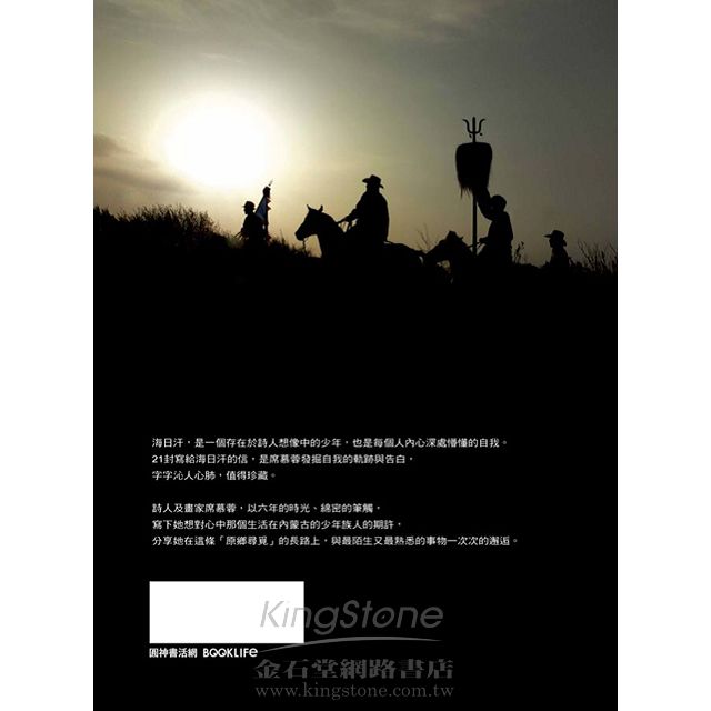 在「海日汗」這個名字誕生之前,在更遙遠的數十年前,詩人席幕蓉就開始了她的原鄉追尋。而從更難以計數的數百年前,蒙古大草原的一群人們,就茫茫無所依歸的藉由口傳、藉由殘破失落的典籍,在確認自我的根源、存在,從《寫給海日汗的21封信》裡,我們想帶著讀者去尋找一種無以名狀的衝動,來自遠古時代留存在DNA的記憶,而不僅僅是瑰麗的文字,壯闊的影像。