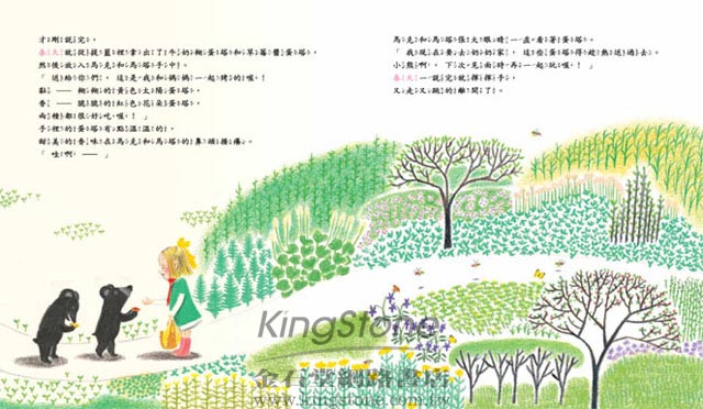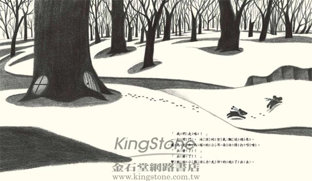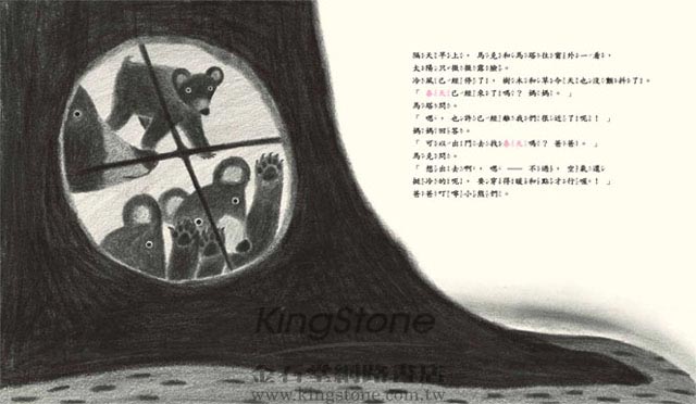 本書以黑白色調訴說著屬於冬天的蕭瑟氛圍,簡單的線條與色彩呼應著仍舊在冬眠中的大地與萬物,然而隨著小熊們一路偶遇的新朋友,似乎神奇又繽紛的春天也悄悄的隨著他們拜訪了即將甦醒的萬物們,故事將結,作者如預期的讓小熊們「遇見春天」,但不一樣的是 ~ 作者有一顆尊重孩子的心,所以她讓孩子自己的想像與觀點來設定孩子心目中屬於春天的意義。