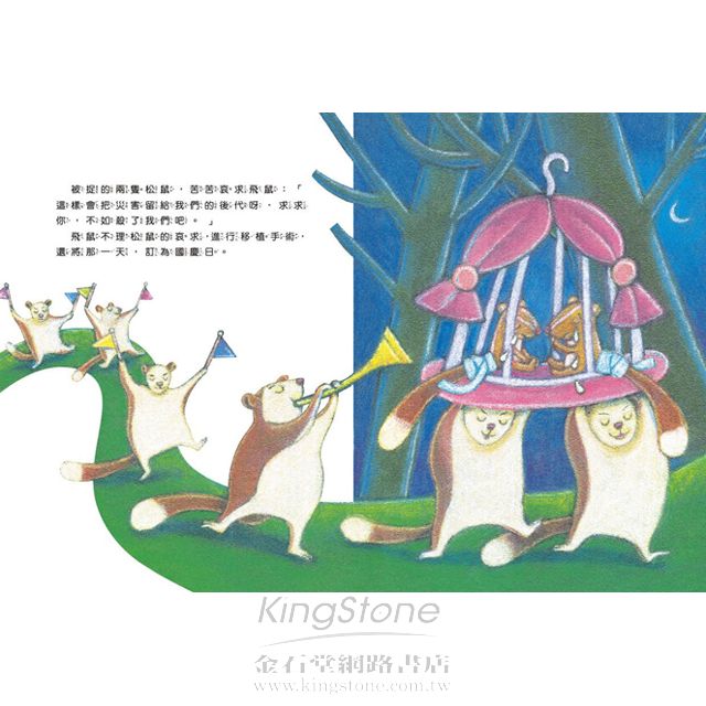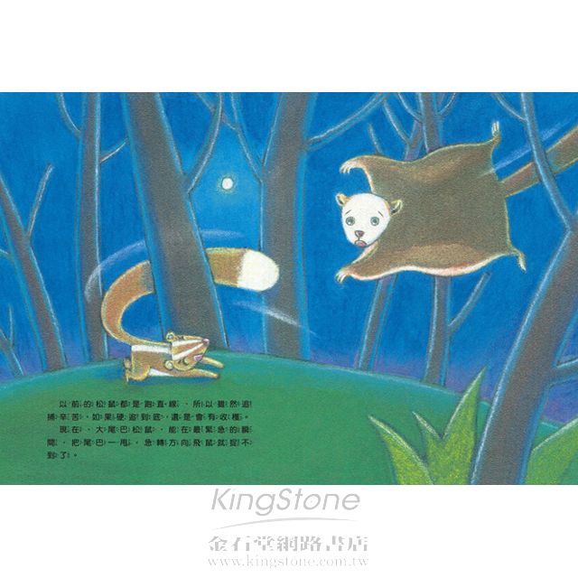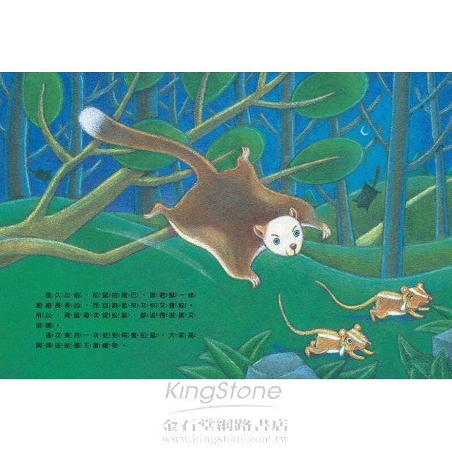 可是為了將誰的尾巴移植到松鼠身上,飛鼠之間起了一場大爭論。到底是誰的尾巴會給松鼠?是聰明的長老?還是尊貴的國王?松鼠裝上大大的尾巴之後,是否就會跑得比較慢、動作變得笨拙,容易被飛鼠捉到?