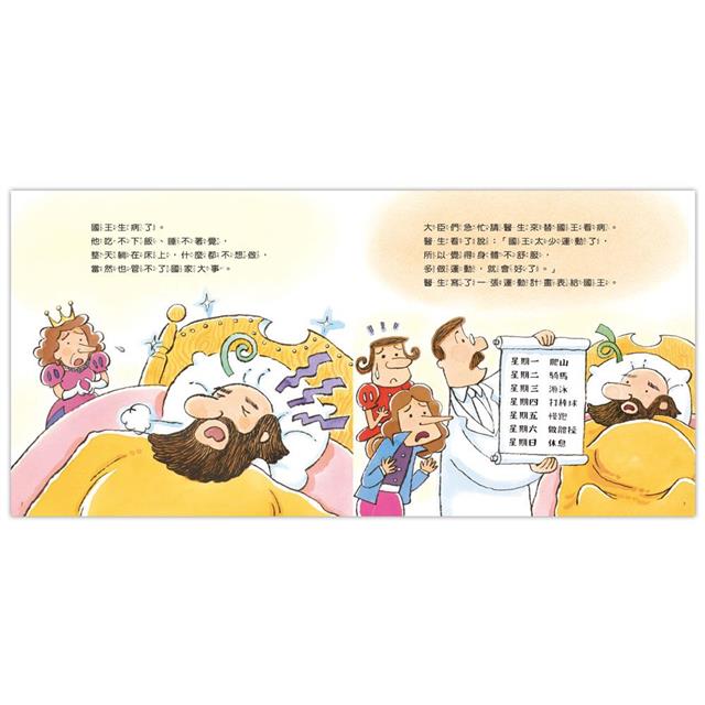 而運動不但能增強體力、讓精神充沛,更有助於孩子建立自信心、提升專注力和穩定情緒的效果!不過,現代孩子使用3C產品的時間較長,導致運動量普遍不足,身體動作能力和體能更是明顯下滑,就像故事一開始的國王總是無精打采,做什麼事都提不起勁。本書將帶孩子看國王如何建立規律運動的習慣,並鼓勵孩子一起動起來,找回身體的健康活力!