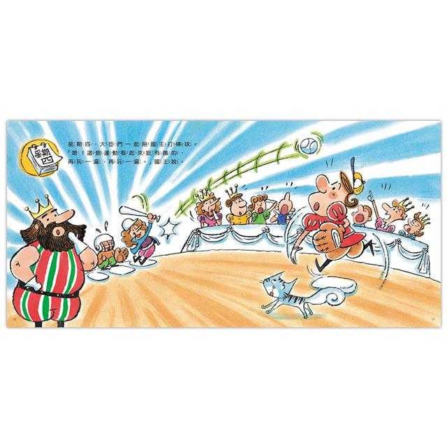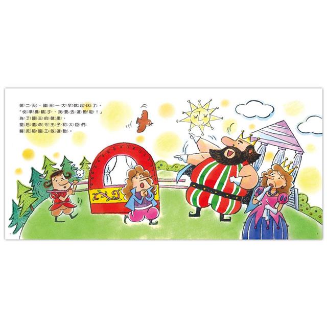 健康的身體來自適當的運動,生病的國王為了強身健體,每天照著運動計畫表「去運動」,皇后、王子和大臣們也陪著國王一起,但是跑了又跑、動了又動,大家早已氣喘吁吁,國王怎麼還能泰然的說「再來一次」呢?答案就藏在圖文中,不妨讓孩子自己去發現其中的幽默趣味,也能從中了解適當的運動與休息的重要性。