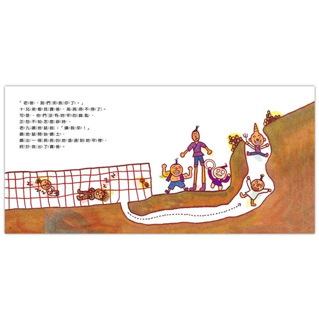 改編自耳熟能詳的民間故事,在金鼎獎畫家湯姆牛的筆下,以獨有的童趣風格,展現出十兄弟個別的鮮明特色,孩子一看角色的造型,馬上就能猜到他們的特殊技能,像是一身金屬鎧甲球般的鐵盔甲、有雙過人長腿的高個兒等,讓傳統故事與現代畫風迸出新火花!