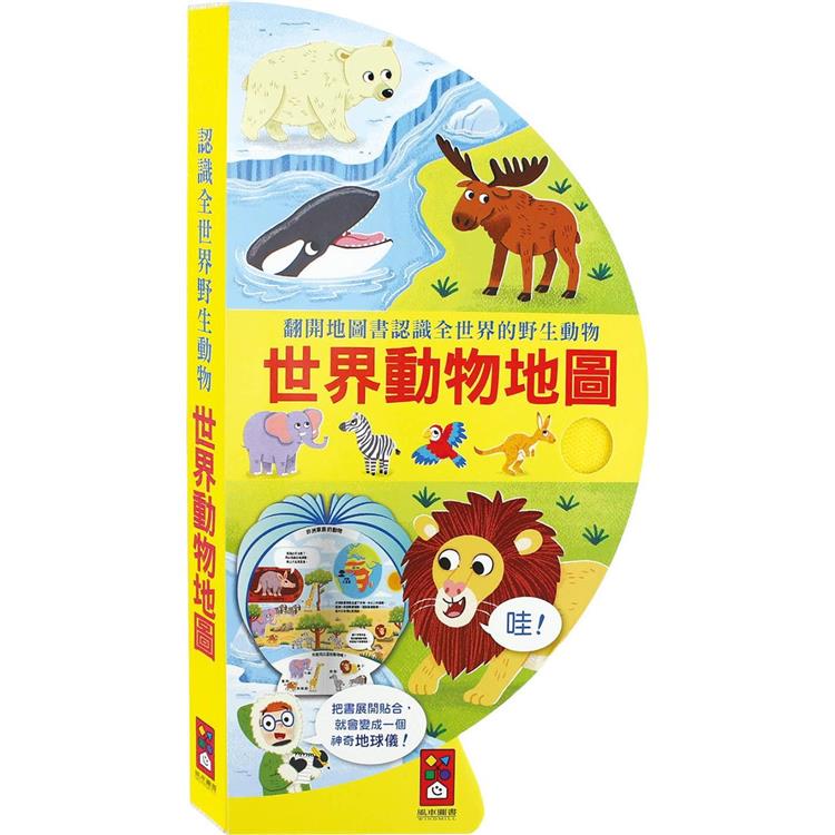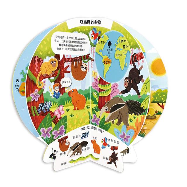 本書插圖鮮豔豐富,讓孩子一起發揮觀察力,找一找動物們藏在哪裡,孩子可從互動中認識豐富多元的自然環境,也能認識世界特有的野生動物。閱讀完畢後,將封底和封面黏在一起,一個地球儀就完成了!