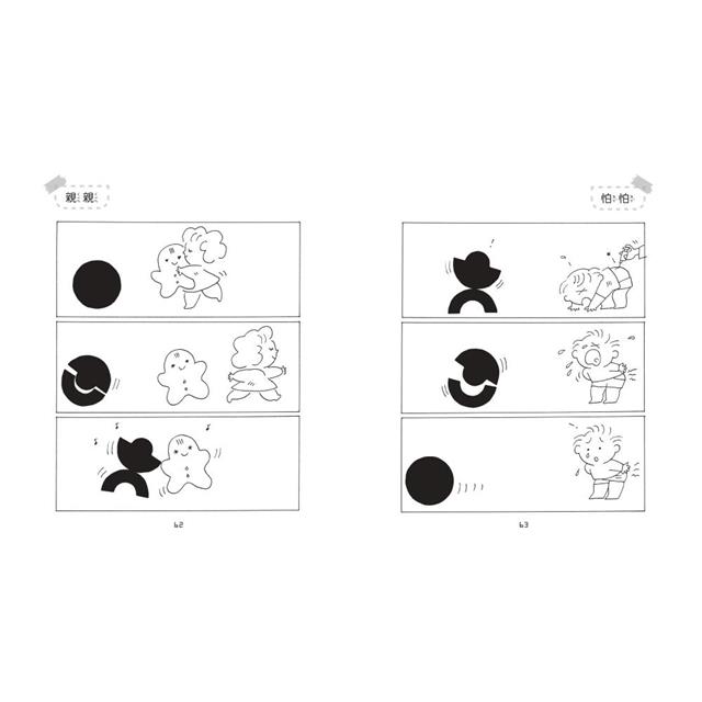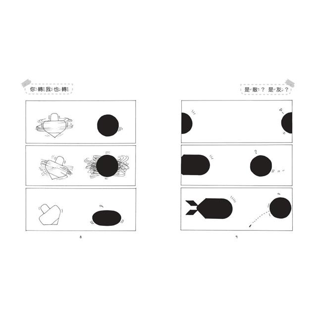 小黑也會分割成兩半,再重組成新的東西或新的形狀,不斷變化也不停發生許多有趣的故事。這時小黑開始了變四、變六或變八的不同面貌,同時也發生意想不到的想像力和幽默感,讓人會心一笑。欣賞過小黑的小故事後,家長可以鼓勵小朋友自己做圓形的黑紙,分割再組合的幾何造形遊戲,小朋友可以有趣的故事和遊戲中,激發想像力和創造力,也獲得學習和成長。