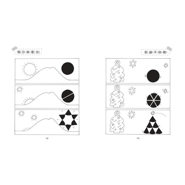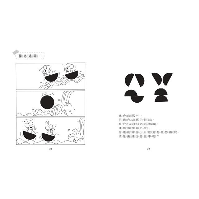 欣賞過小黑的小故事後,家長可以鼓勵小朋友自己做圓形的黑紙,試著玩均等分割再組合的造形遊戲,他們將會發現最簡單的切割方法,就是讓直線通過圓心。而這正是認識正圓的開始,也就進入幾何的領域。而切割後的重組遊戲則進入圖形創作的領域。小朋友在這樣有趣的遊戲中,自然獲得學習和成長。