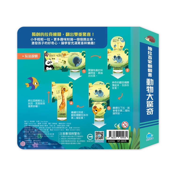 獨創的抽拉機關,帶給孩子獨一無二的驚喜──先思考關於動物的知識提問,再輕輕往下拉,新的頁面就會彈出來揭曉答案,幫助孩子認識動物的外貌、習性、特徵等知識。這種全新的互動式閱讀,不僅讓孩子更專注,還能培養探索精神,讓學習變得更加有趣!