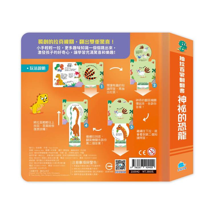 獨創的抽拉機關,帶給孩子獨一無二的驚喜──先思考關於恐龍的知識提問,再輕輕往下拉,新的頁面就會彈出來揭曉答案,幫助孩子認識恐龍的外貌、習性、特徵等知識。這種全新的互動式閱讀,不僅讓孩子更專注,還能培養探索精神,讓學習變得更加有趣!