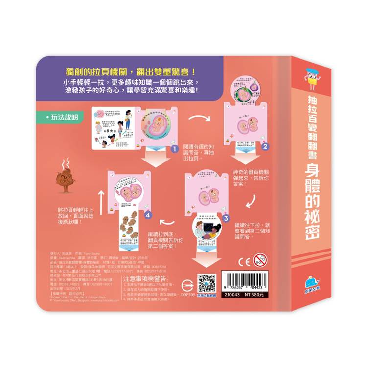 獨創的抽拉機關,帶給孩子獨一無二的驚喜──先思考關於人體的知識提問,再輕輕往下拉,新的頁面就會彈出來揭曉答案,幫助孩子認識生殖、呼吸、消化、感官等知識。這種全新的互動式閱讀,不僅讓孩子更專注,還能培養探索精神,讓學習變得更加有趣!