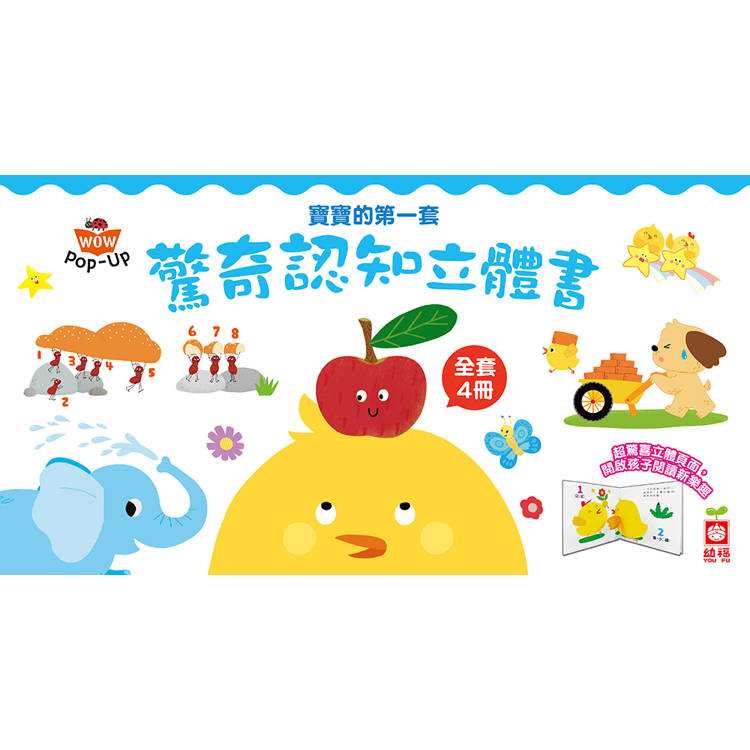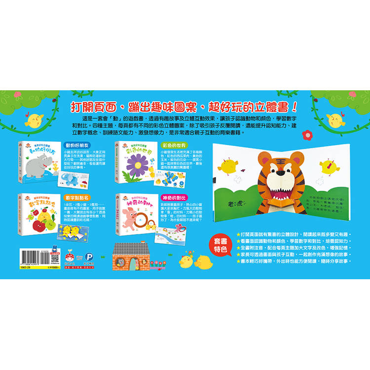 這是一套會「動」的遊戲書,共有《動物好朋友》、《數字點點名》、《彩色的世界》、《神奇的對比》四個主題,每頁都有不同的彩色立體圖案,透過有趣故事及立體互動效果,讓孩子認識動物和顏色,學習數字和對比。