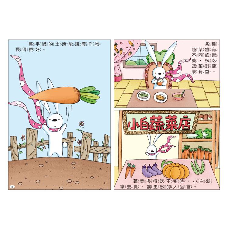 小白擁有一座充滿驚喜的農場!小白種植了許多蔬菜,飼養了許多動物,牠為什麼要這麼做呢?其實每一種動物與植物,都有特別的用處與小祕密。孩子能在閱讀中了解食物從哪裡來、體驗農場生活的辛苦與樂趣,並學習愛護大自然。