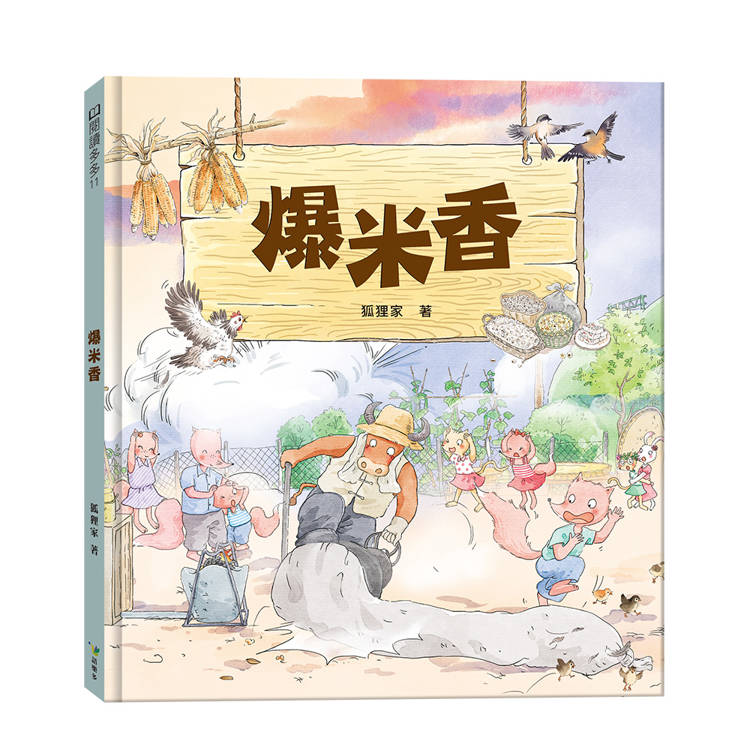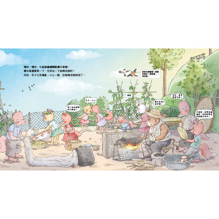 牛爺爺架起爆米花機,狐狸爸爸用玉米葉點火,