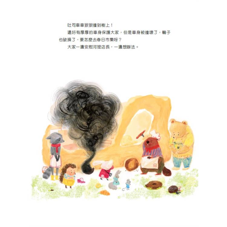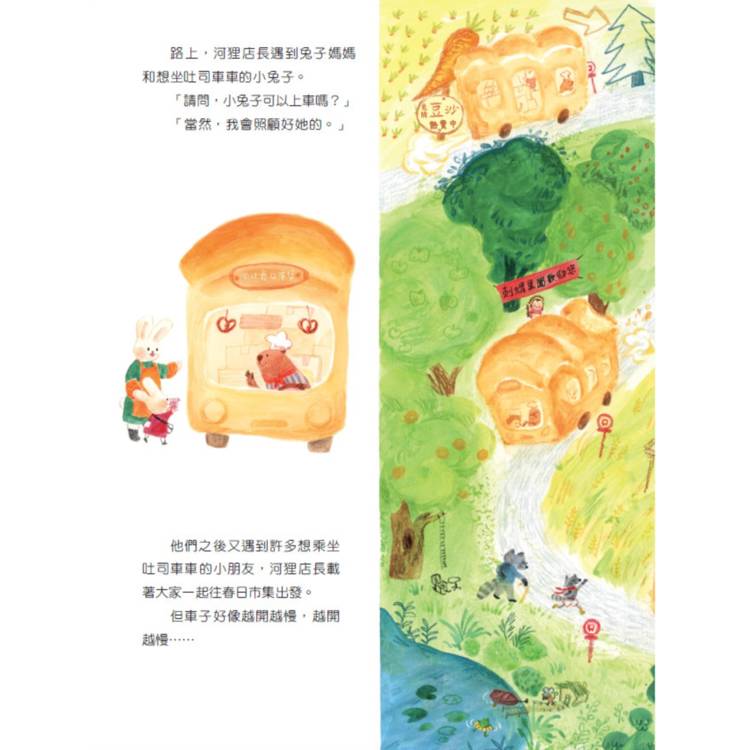 河狸店長遇到兔子媽媽和想坐吐司車車的小兔子。