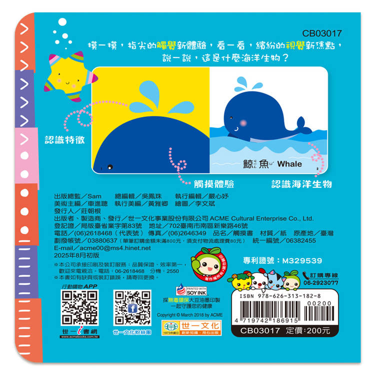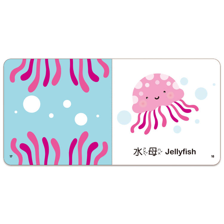 本書是專為0歲以上小朋友設計的海洋生物觸摸書,厚紙書好翻不易毀損,書籍做圓角處理,使用上更安全。內頁文字採中英雙語,並加附注音,引導幼兒認識海洋生物,內頁特別做特殊上光處理,立體浮凸效果讓幼兒用手觸摸,達到視覺、觸覺同步學習的效果。