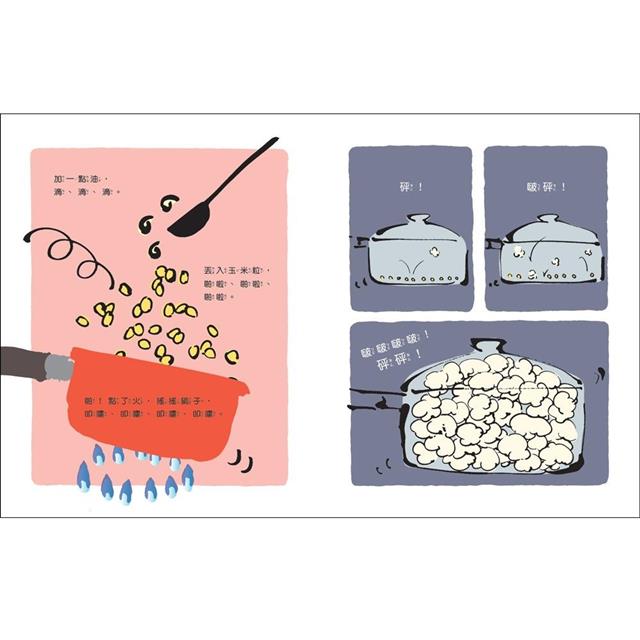 翻開和大聲朗讀《砰砰爆米花》這本充滿聲音動感和想像力十足的繪本,讓我想起小時候第一次看到爆米花製作過程,那如同魔術表演的砰砰聲響、雪白爆米花瞬間擠滿鍋和香甜的氣味撲鼻而來的驚喜感。……這樣簡單童趣的書,不僅滿足想像力蓬勃發展的幼兒,更能在孩子四歲左右想像力達到顛峰並開始發展創造力的階段,提供大人培養孩子發揮想像力,一起進行想像遊戲的絕佳範本。因為孩子的想像遊戲建立在生活經驗上。當大人從日常生活中有意識的陪伴和引導孩子,他們就能發展出像書中孩子的想像遊戲和創造力。而創造力正是解決問題的能力,也是AI世代孩子需要具備的重要能力。