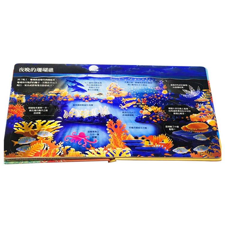 白天魚群穿梭覓食,夜晚珊瑚伸出觸手捕食,鯊魚在陰影中巡游。透過日夜對比,讓孩子看見同一片海洋在不同時間的生命活動。