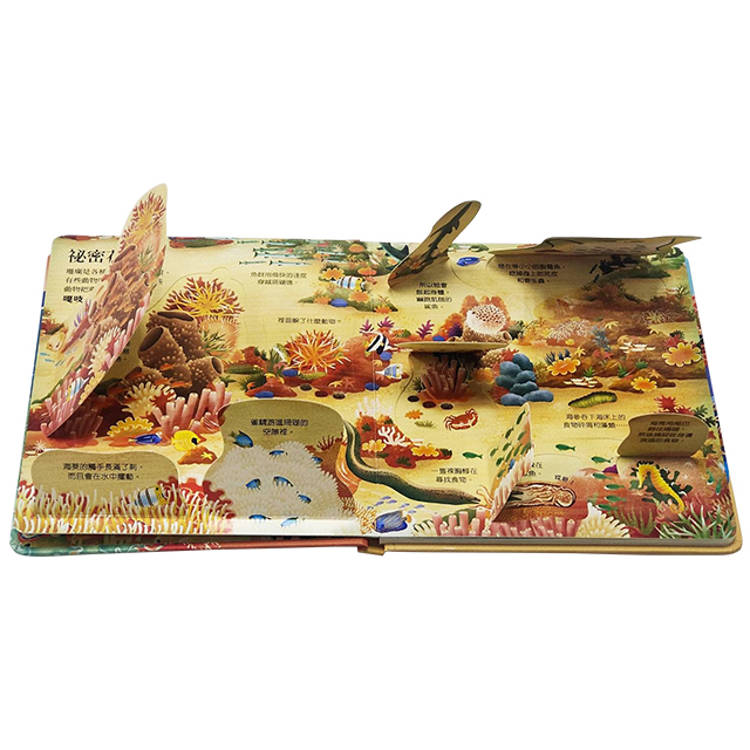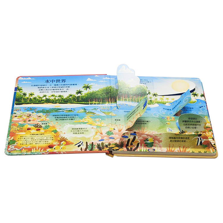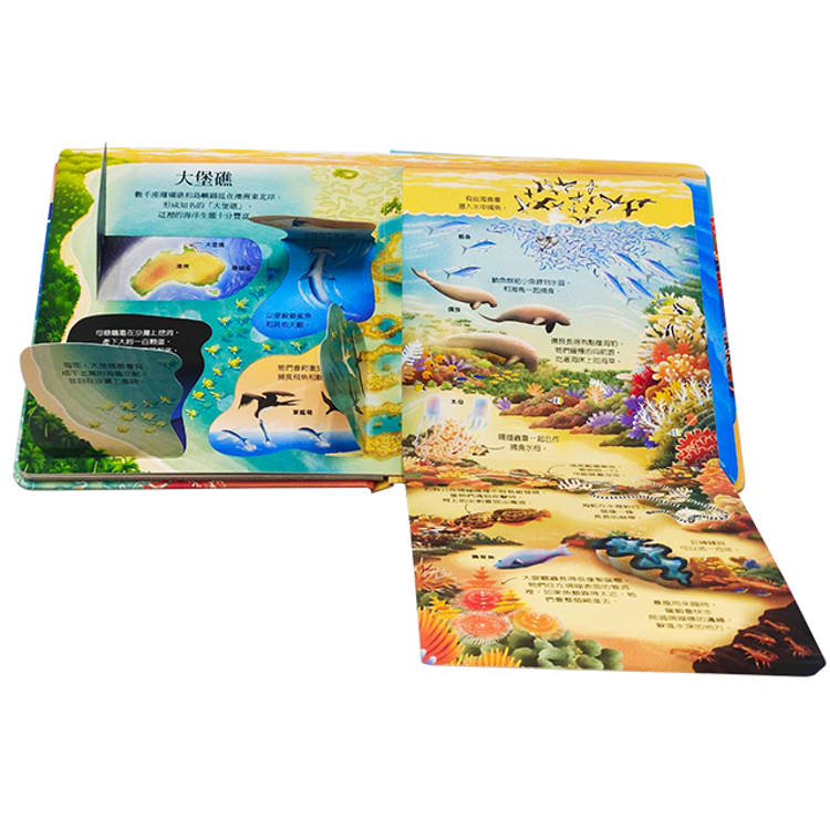 翻開書中的機關,可以看到火山島沉入海底,最後形成環狀的珊瑚島。