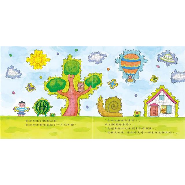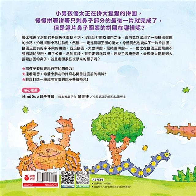 拼圖王國有好多不同的拼圖,西瓜拼圖、大象拼圖、龍捲風拼圖……,優太在拼圖王國展開不可思議的歷險、搭了公車、遇到雷神、甚至走到迷宮裡,經歷了各種奇遇,最後優太能找到大猩猩拼圖的鼻子,並且走回家恢復原來的樣子嗎?