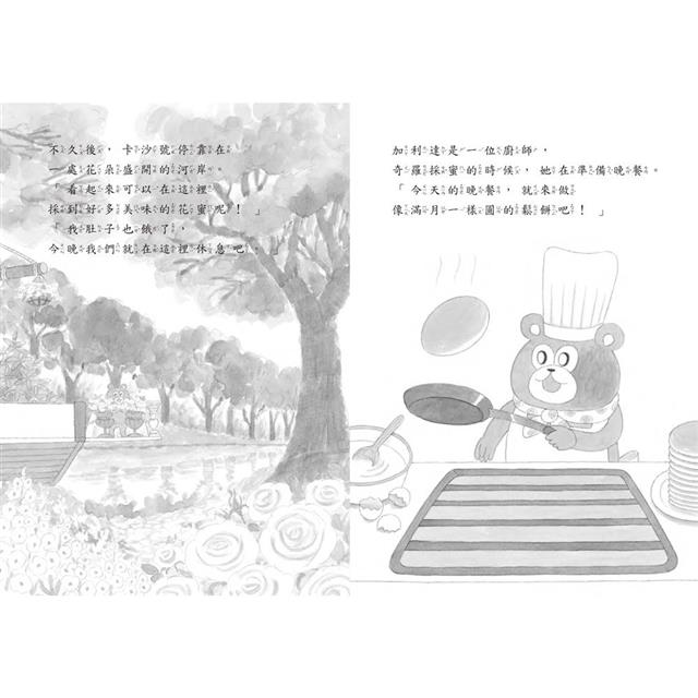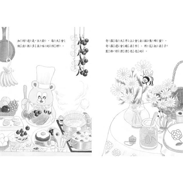 童趣討喜的角色——小熊廚師加利達和蜜蜂奇羅,誤打誤撞隨著海盜船開啟一段又一段的旅程,讀者也跟著造訪柳暗花明又一村的情境與場景,但彷彿不論發生什麼事,美食總能溫暖彼此的心,成為真摯情誼的最佳註腳。