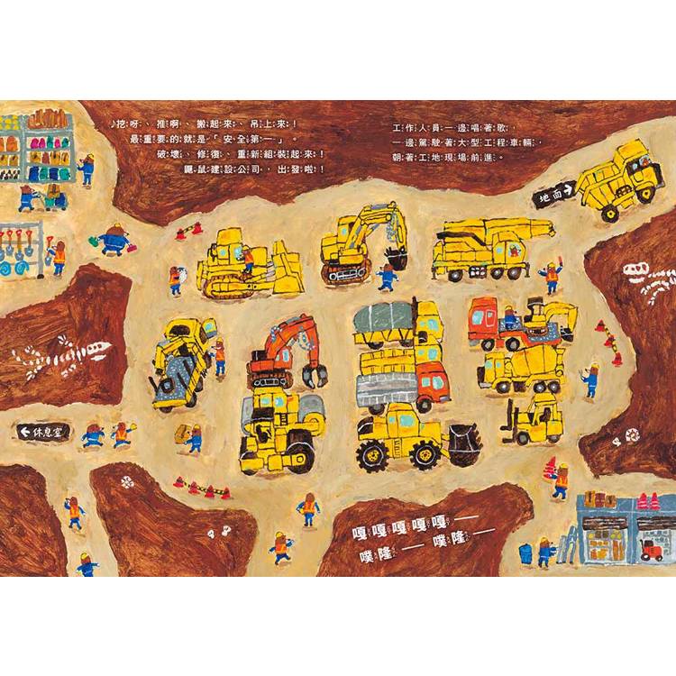 藉由故事畫面呈現正在工作中的各式工程車,展現出不同工程車輛的外型特色、功能用途、施工時會發出的聲響等,且書頁中的工程車都彷彿以孩子觀看視角的巨大模樣呈現,讓孩子可以盡情感受挖土機、推土機、移動式起重機、翻斗車等各種工程車的魅力。