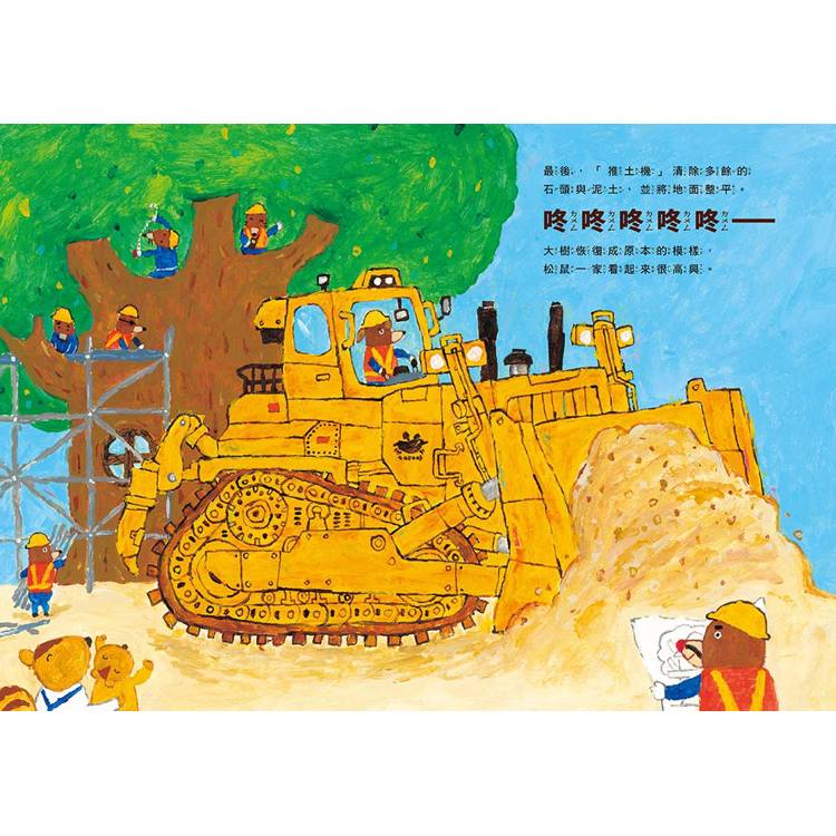 在松鼠家的樹屋危在旦夕之際,幸好有鼴鼠建設公司的幫助,鼴鼠們立即出動,集結眾人之力,成功挽救了瀕臨倒塌的樹屋,並完美改造了松鼠家。繪本可愛童趣的畫風為小讀者展示了房子改造的神祕過程,還出動了挖土機、移動式起重機、推土機等帥氣的工程車完成任務,令人大開眼界!鼴鼠們全力以赴,分工合作,展現出認真工作的樣子,令人肅然起敬。即使面對再困難的任務,只要齊心協力,便能創造奇蹟。