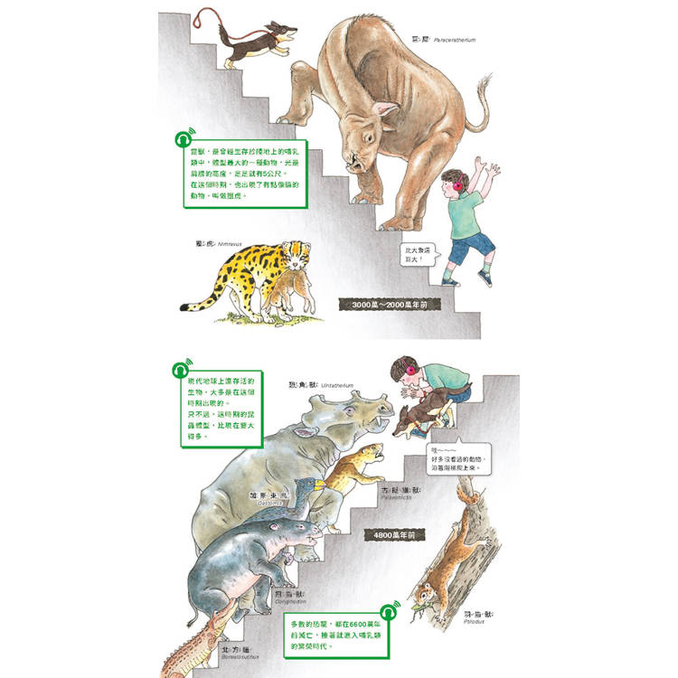 翻開縱向的頁面,隨著小狗一起逐步走下通往底下的昏暗樓梯。隨後,遠古時代的生物們便出現了。戴上耳機,就像美術館的語音導覽一樣,有詳細的解說。這是一本能夠了解人類歷史的科學繪本。(小萍/30多歲;3歲女兒)